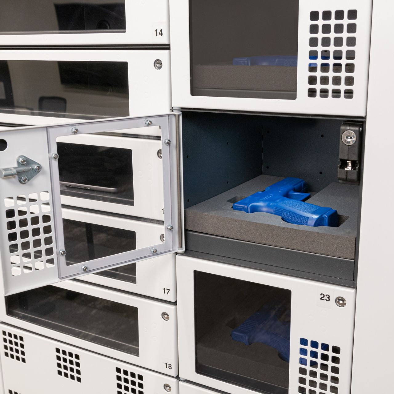 The systems can be installed centrally to compliment your existing armory, adding per-firearm access control, tracking and reporting. Systems can also be distributed across your property for fast emergency response, while maintaining centralized control and visibility of all activity.